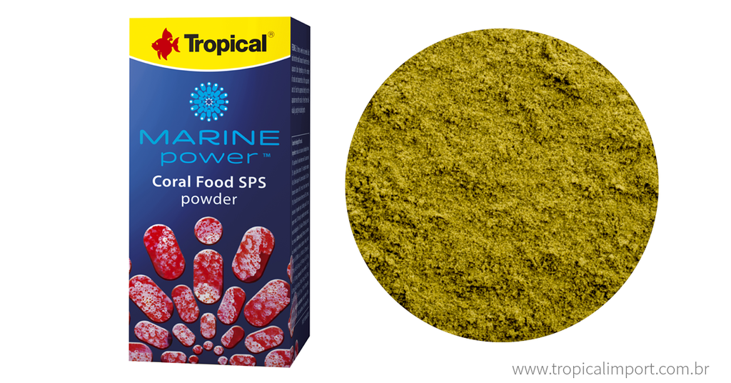 Alimento com crustáceos, moluscos marinhos e 5 espécies de algas em forma de pó (1-250 µm) para corais não fotossintéticos, corais moles, SPS, bem como outros organismos que se alimentam por filtração, tais como esponjas, tunicados e dentre outros.